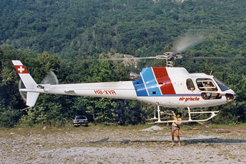 | HB-XYR of Air Grischa arrived in Europe by sea - Photo Flugarchiv Graubünden © Aug-1991 | HB-XYR of Air Grischa during work in Valle Maggia - Photo Flugarchiv Graubünden © Jun-1992 |