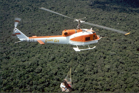 | HB-XCG with Gum Air titles over the forests of Surinam - Photo by Peter Aegerter © Nov-76 | HB-XCG of Heliswiss at work in Zinols Bergün - Photo by Roland Küng © 2-Aug-79 |