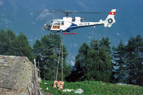| HB-XFW of Air Grischa - their first helicopter - Photo by Rolf Zimmermann © 1976 | HB-XFW of Air Grischa at work in a mountain region of Ticino - Photo by Michele Ceresa © 1977 |