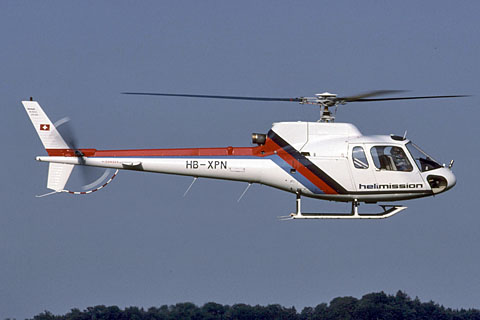 | HB-XPN at Bern-Belp - the 2nd Helimission AS350B - Photo by Hans-Peter Zürcher © Sep-85 | HB-XPN of Helimission at Bern-Belp during a check flight - Photo by Markus Herzig © 6-Aug-99 |