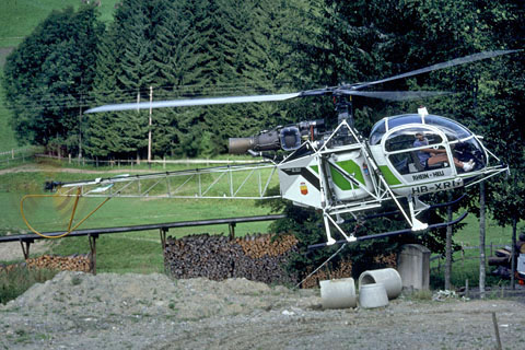 | HB-XRD of Rhein-Helikopter AG at snowy Samedan - Photo by Werner Häuselmann © 3-Jan-91 | HB-XRD of Rhein-Helikopter AG during logging at Einsiedeln - Photo by Markus Herzig © 12-Aug-91 |