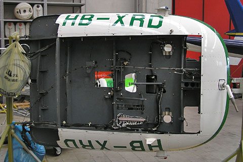 | HB-XRD of Heli-TV under heavy maintenance at Caiolo ITA - Photo by Damiano Gualdoni © 29-Jul-05 | HB-XRD in the new livery of Heli-TV SA at Lodrino - Photo by Damiano Gualdoni © 2-Sep-06 |