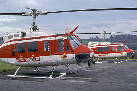 | HB-XRI of Heliswiss hovering at the homebase Bern-Belp - Photo by Markus Herzig © 16-Mar-90 | HB-XRI and HB-XFZ of EXO Services SA at Bern-Belp - Photo by Markus Herzig © 15-Nov-95 |