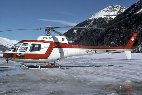 | HB-XTE on the frozen helipad at Samedan - Photo by Markus Herzig © 11-Mar-90 |