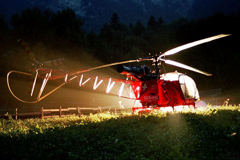 | HB-XTM of BOHAG in new colors on a rescue flight at Bern-Insel - Photo by Markus Herzig © 4-Oct-97 | HB-XTM of BOHAG during a cold winter day in Diemtigtal - Photo by Adrian Rösti © 2-Dec-98 |