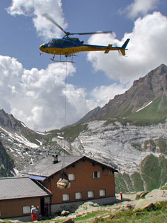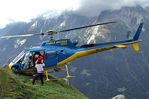 | HB-XVM of Heli Rezia AG at Leit cabin above Rodi Fiesso - Photos by Sven Fehler © 16-Jul-04 | HB-XVM of Heli Rezia AG at Balnisc 2300m to unload pax - Photo by Sven Fehler © 29-Aug-04 |