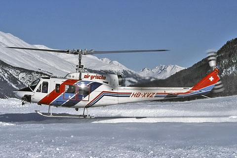 | HB-XVZ of Air Grischa working at Crap Sogn Gion - Photo ETH-Bibliothek Zürich Bildarchiv © 29-Aug-90 | HB-XVZ of Air Grischa at Samedan - Photo by Markus Herzig © 23-Dec-91 - MHP |