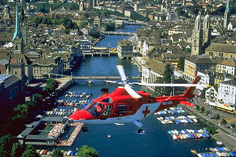 | HB-XWK of Rega at Milano-Malpensa on the delivery flight - Photo by Damiano Gualdoni © 21-Dec-94 | HB-XWK of Rega over the city of Zürich - Photo by REGA © 1996 |