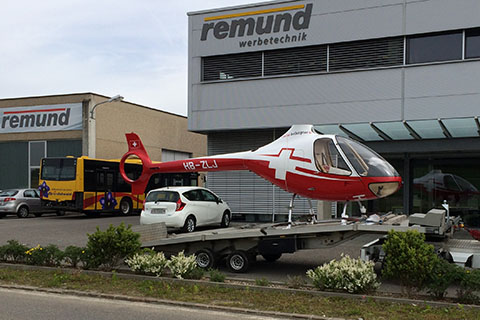 | HB-ZLJ of Swiss Helicopter AG new painted by Remund - Photo by Bruno Christ © 6-May-14 | HB-ZLJ of Swiss Helicopter AG taking off at Locarno - Photo by Thomas Schmid © 28-Sep-14 |