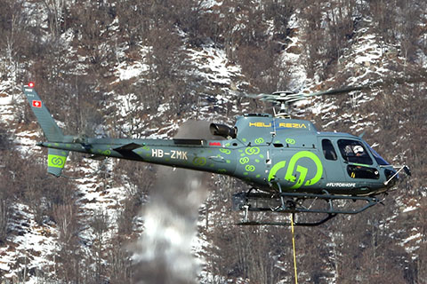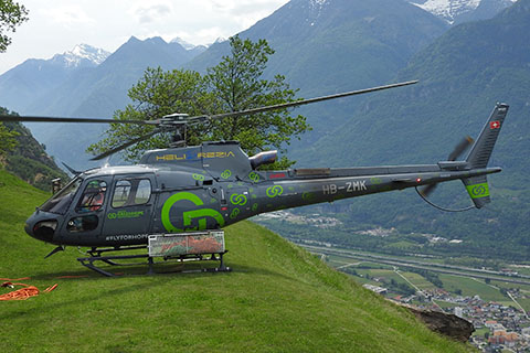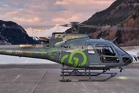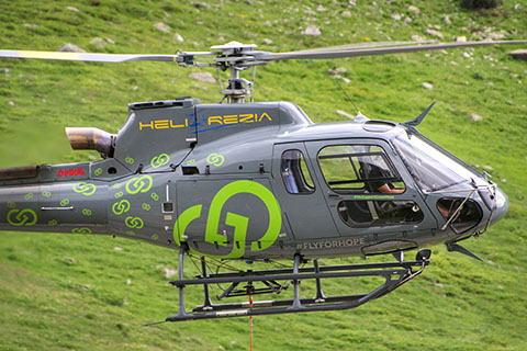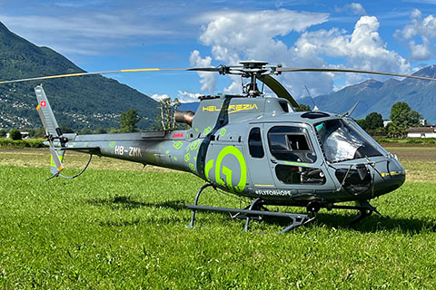 | HB-ZMK of Heli Rezia AG over Locarno - Photo by Oliver Colombi © 16-Apr-19 | HB-ZMK of Heli Rezia AG with Greenhope logos at Oberalppass - Photo by Michele Ceresa © 5-Aug-19 |