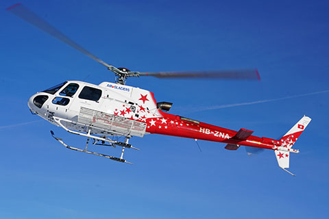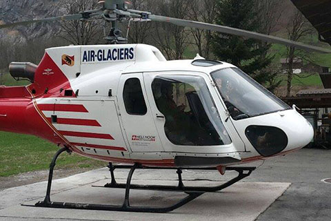 | HB-ZNA of Air-Glaciers SA with a Bernese flag at Saustal - Photo by Matthias Hansen © 4-Oct-13 | HB-ZNA with the Maximum Pilot View Kit of swiss rotor solutions - Photo by Bruno Siegfried © 7-Apr-16 |