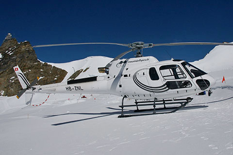 | HB-ZNL of Mountain Flyers at Sion with camera during TdR - Photo by Jean-Etienne Allet © 29-Apr-16 | HB-ZNL of Mountain Flyers 80 Ltd in the region of Zermatt - Photo by Peter Zurniwen © 8-Feb-18 |