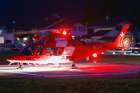 | HB-ZRT with AW169 D-HHTJ during a test with Rega at Wilderswil - Photo by Nick Däpp © 19-Aug-20 | HB-ZRT of Rega at Meiringen-Gesundheitszentrum - Photo by Peter von Gunten © 2023 |