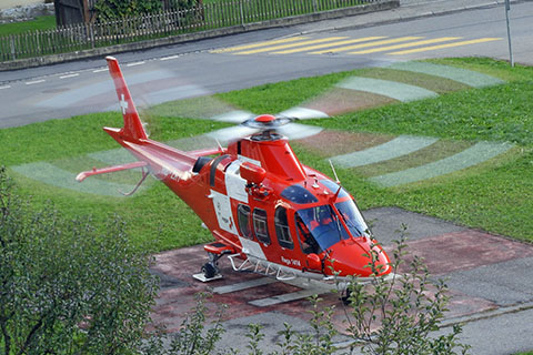 | HB-ZRT at Kleine Scheidegg in front of the Eiger - Photo by Oscar Bernardi © 21-May-10 | HB-ZRT of Rega on the Interlaken hospital helipad - Photo by Andreas Gauch © 16-Feb-17 |