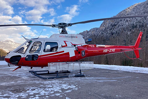 | HB-ZVE of Swiss Helicopter AG at Untervaz - Photo by Roland Küng © 22-Jun-21 | HB-ZVE of Swiss Helicopter at Tavanasa with Skipatrol Laax sticker - Photo by Marco Schmid © 6-Jan-22 |
