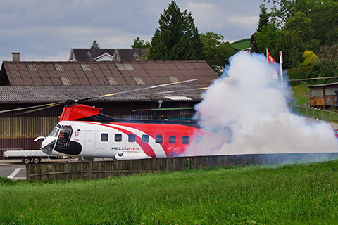 | N185CH of Heliswiss International taking off at Haltikon - Photo by Adrian Romang © 14-Jun-23 | N185CH of Heliswiss International at Haltikon with a smoky startup - Photo by Janis Siegfried © 12-Aug-23 |