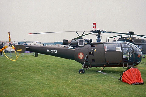 | V-232 of Swiss Air Force at Locarno equipped with skis - Photo by Don Hewins © 11-Sep-91 | V-232 of Swiss Air Force with a bambi bucket at Middle Wallop UK - Photo by Don Hewins © 4-May-94 |
