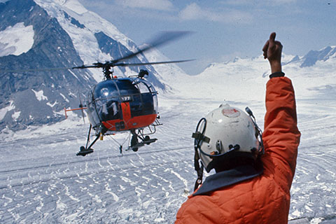 | V-277 of Swiss Air Force approaching Konkordiahütte - Photo ETH-Bibliothek Zürich, Bildarchiv © 1976 | V-277 of Swiss Air Force in the early years - Photo Flugarchiv Graubünden © 1980s |