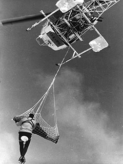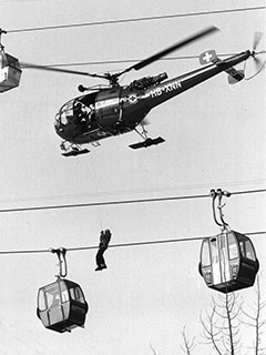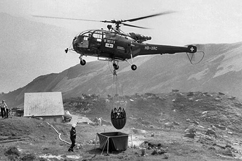 | HB-ZOY of Air Zermatt AG at Rothornhütte - Photo by Raphael Weichselbraun © 3-Aug-23 | V-240 of Swiss Air Force during a sheep rescue at Hinterrhein - Photo by CH.Bieler via R.Küng © 1980 |
