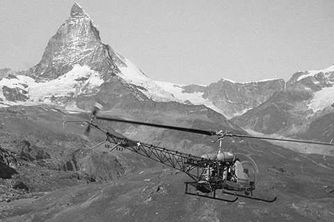 | HB-XAX of Heliswiss in front of the Matterhorn - Photo ETH Bibliothek Zürich Bildarchiv © 1958 | HB-XAX and HB-XAT of Heliswiss at Il Capütschin - Photo Flugarchiv Graubünden © 23-Mar-60 |
