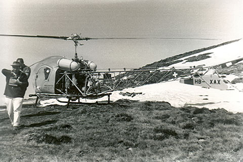 | HB-XAX of Heliswiss in the region of Laax - Photo Flugarchiv Graubünden © May-63 | HB-XAX of Heliswiss at Basel - Photo collection Werner Häuselmann © 1964 |