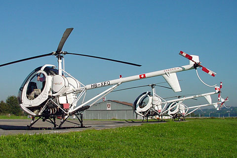 | HB-XFQ of Fuchs Helikopter arriving at Samedan on a great day - Photo by Markus Herzig © 30-Jan-98 | HB-XFQ in front of the Heliswiss S269C fleet at Bern - Photo by Stefan Bucheli © 2-Sep-04 |
