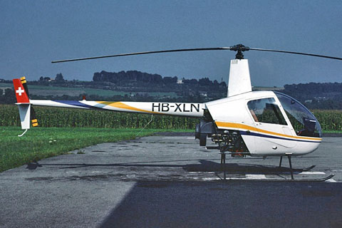 | HB-XLN of Georg Heussi at Bern-Belpmoos in old colours - Photo by Markus Herzig © 7-Sep-89 | HB-XLN of Georg Heussi at Benken in new colors & modified to R22HP - Photo by Georg Heussi © 2001 |