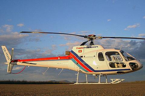 | 5R-MVN of Helimission at Ivato - Photo courtesy of Samuel Marti © May-02 | HB-XON of Stiftung Heli-Mission fresh overhauled at Samedan - Photo by Hanjörg Pfäffli © 16-Dec-13 |