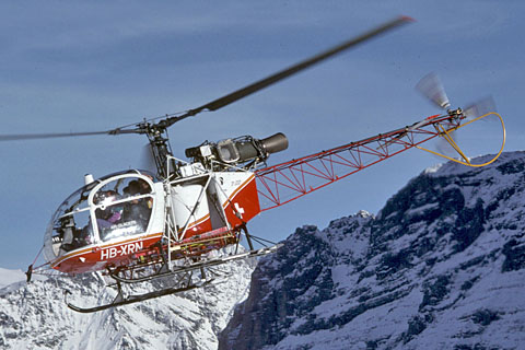 | HB-XRN of Air Glaciers SA approaching Lauberhorn helipad - Photo by Markus Herzig © 16-Jan-99 | HB-XRN at Rosablanche - Photo by Nicolas Fauchère © 2001 |