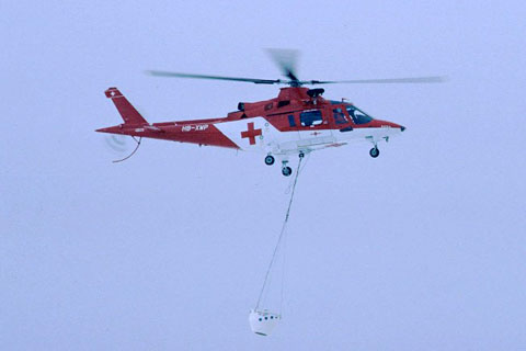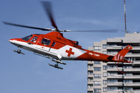 | HB-XWP of Rega with 600l Chadwick tank - Photo by Markus Herzig © 16-Dec-95 | HB-XWP of Rega approaching Bern-Insel hospital - Photo by Markus Herzig © 24-Apr-97 |