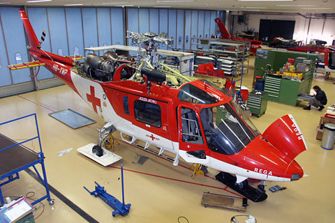 | HB-XWP of Swiss Air Ambulance under maintenance at Zurich - Photo by Tino Dietsche © 12-Nov-03 | HB-XWP of Rega at Samedan during IFR / Night training - Photo by Michele Ceresa © 8-Dec-04 |