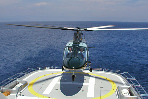 | HB-ZDT on the heli platform of MV Lady Marina in Greece - Photo courtesy Gianni Testa © 10-Jun-04 | HB-ZDT of Eliticino about to land on Lady Marina off St.Tropez - Photo by Gianni Testa © 24-Jul-06 |