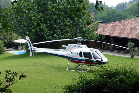 | HB-ZEC of Eliticino SA at Viareggio on a roof helipad - Photo by Gianni Testa © 31-May-02 | HB-ZEC now with full Eliticino titles in scenic Val Cama - Photo by Gianni Testa © Sep-02 |