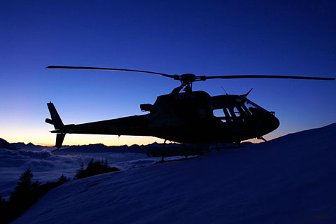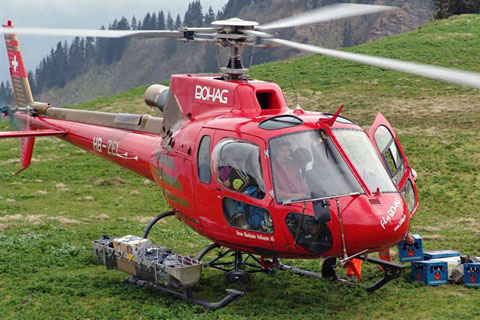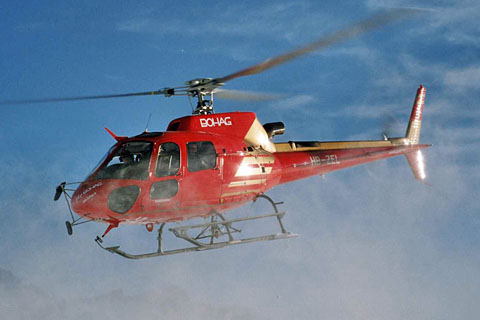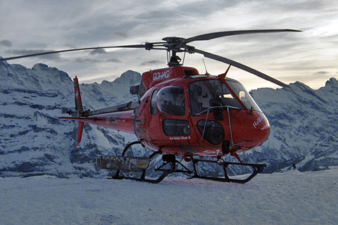 | HB-ZEL of BOHAG flying in some beers to Gunggalp - Photo by Rene Maurer © 10-Jun-04 | HB-ZEL of BOHAG at Männlichen helipad - Photo by Alister Renton © 30-Dec-04 |
