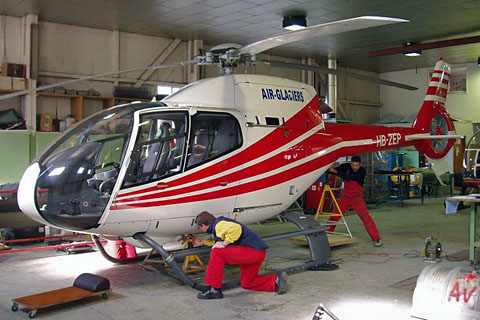 | HB-ZEP of Air Glaciers SA / Watcopter SA at Bern-Belp - Photo by Markus Herzig © 10-Jul-03 | HB-ZEP at Sion undergoing last work on the new painting - Photo by Nicolas Fauchere © Mar-04 |