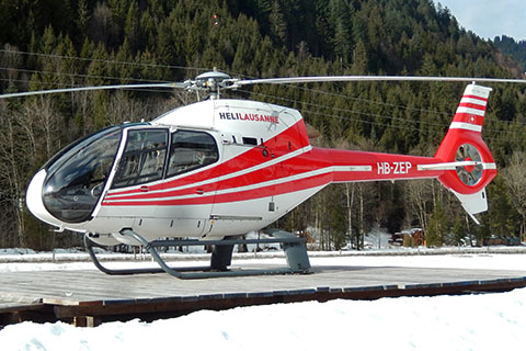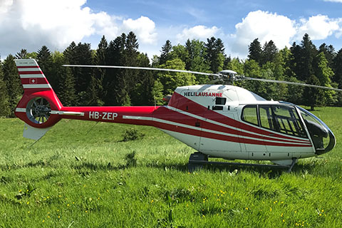| HB-ZEP of Héli-Lausanne SA out in the green nature - Photo by Daniel Grandguillaume © 23-May-17 | HB-ZEP of Héli-Lausanne SA at Gstaad heliport - Photo by Ernst Bach © 9-Jan-18 |