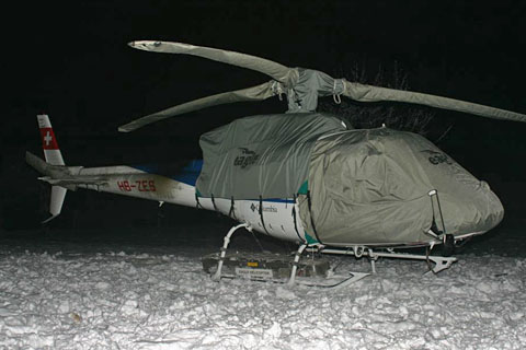 | HB-ZES on Pointe du Tsate 3077m in front of Dent Blanche - Photo by Lionel May © 17-Nov-07 | HB-ZES packed for overnight parking at Basel - Photo by Gerard Fabich © 17-Dec-08 |
