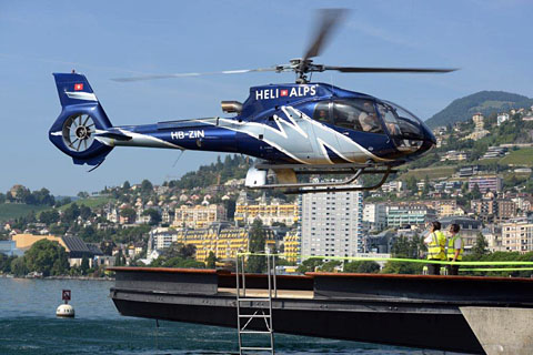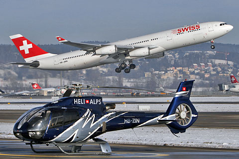 | HB-ZIN of Heli Alps at Montreux seafront - Photo by Joel Bessard © 9-Sep-12 | HB-ZIN of Heli Alps at Zürich with a departing Swiss A340 - Photo by Markus Herzig © 23-Jan-13 - MHP |