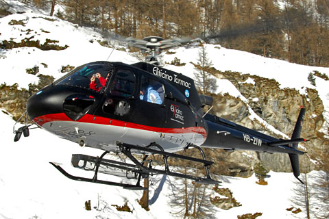 | HB-ZIW is taking off at Monti Motti, Gordola - Photo by Giorgio Schuler © 22-Jul-08 | HB-ZIW with Air Zermatt stickers at Zermatt - Photo by Hans Zurniwen © 2-Jan-09 |