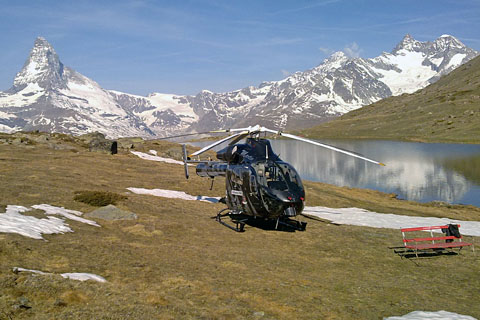 | HB-ZKE of Fuchs Helikopter at Stellisee 2540m with Matterhorn - Photo by Dino Janser © 11-May-11 | HB-ZKE of Fuchs Helikopter at Laon for EMS ops in France - Photo by Robert Stokmaier © 6-May-13 |