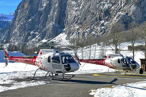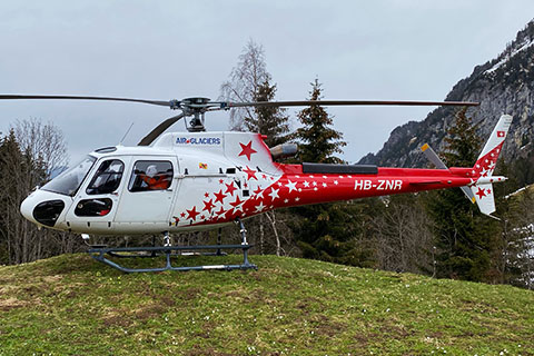 | HB-ZNR of Air Glaciers approaching Lauterbrunnen heliport - Photo by Martin Dällenbach © 29-Apr-17 | HB-ZNR of Air Glaciers AG at Lauterbrunnen with Fortis sticker - Photo by Pierre Gillard © 26-May-18 |