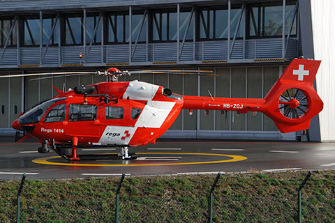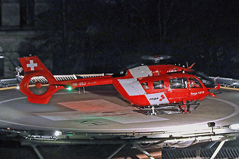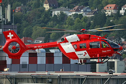 | HB-ZQJ as Rega 7 just arrived at Stuttgart after a transport - Photo by Matthias Hansen © 4-Feb-24 | HB-ZQJ of Rega taking off at Marienkrankenhaus Stuttgart - Photo by Matthias Hansen © 5-Sep-24 |