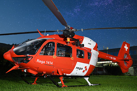 | HB-ZQN of Rega at the base in St.Gallen - Photo by Paul Ulrich © 7-Aug-19 | HB-ZQN of Rega under a night sky at the base in St.Gallen - Photo by Eric Oberhofer © 15-Aug-19 |