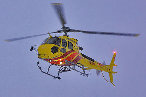 | HB-ZSV of Heli Bernina AG in snowfall at Samedan - Photo by Thomas Bäbler © 10-Mar-24 | HB-ZSV of Heli Bernina AG with Polizei titles at Samedan - Photo by Markus Herzig © 26-Aug-25 |