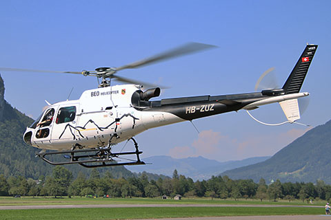 | HB-ZUZ with BEO Helicopter titles at Interlaken - Photo by Janis Siegfried © 29-Mar-22 | HB-ZUZ in new BEO Helicopter look at Lauterbrunnen - Photo by Thibault Lambert © 6-Jul-23 |