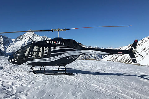 | HB-ZYN of Héli-Alpes SA during takeoff at Zurich airport - Photo by Marcel Kaufmann © 6-Sep-18 | HB-ZYN of Héli-Alpes SA under blue sky at Unterrothorn - Photo by Hans Zurniwen © 24-Feb-19 |