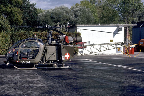 | V-54 of Swiss Air Force with an external load - Photo Flugarchiv Graubünden © 1960's | V-54 of Swiss Air Force at Bern-Belp - Photo by Markus Herzig © 18-Oct-91 |
